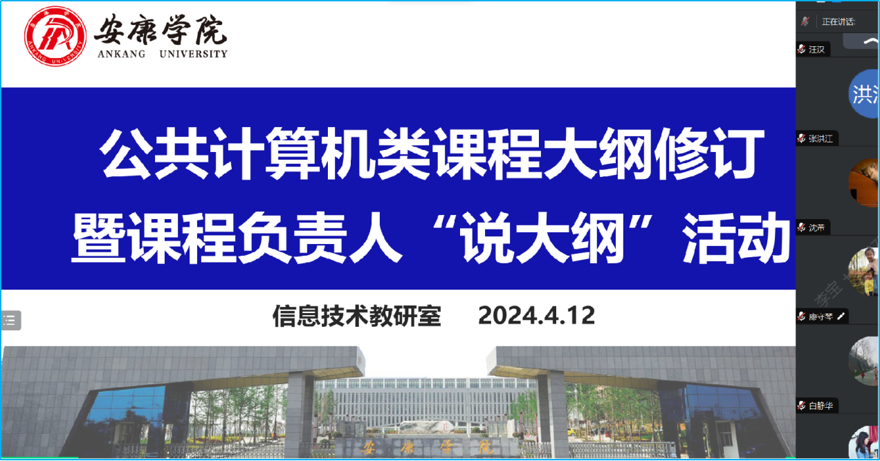 为迎接学校本科教育教学审核评估工作,深化课程改革,提高公共计算机类课程任课教师的教学水平和能力,结合学校要求及学院实际情况,信息技术教研室于2024年4月12日开展“公共计算机类课程教学大纲的修订暨课程负责人说大纲”的教研活动。此次活动采用腾讯会议线上形式举行,活动由李宝主持,PP电子游戏平台网站教学副院长宋权华、信息技术教研室全体教师参加了本次活动。