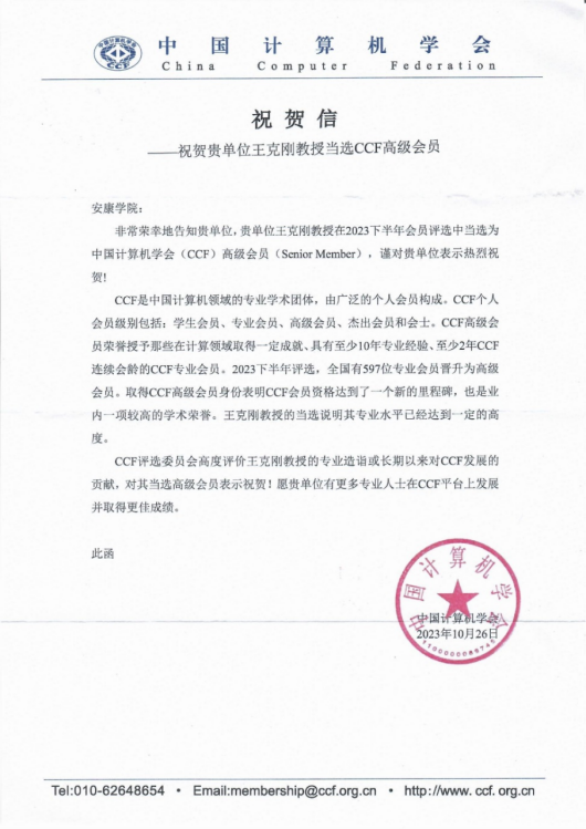 近日,中国计算机学会(CCF)向我校发来贺信,祝贺我校PP电子游戏平台网站王克刚教授当选CCF高级会员,同时欢迎我校有更多计算机专业人士在CCF平台上发展,并取得优异的成绩。