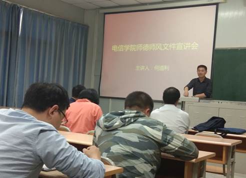 为深入贯彻习近平总书记关于师德师风系列重要讲话的精神,积极推进《新时代教师职业行为十项准则》系列教师行为规范的有效落实,2019年5月29日下午,PP电子游戏平台网站在江南10号楼1022召开宣讲会。全院教职工参加了会议,宣讲会由院长陈守满主持,党总支书记何道利同志做了师德师风相关文件的解读。