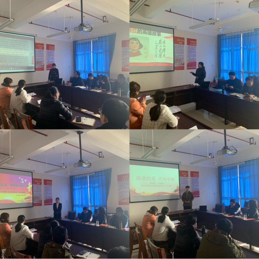 初审会上,教工第一、二党支部的教师与学生第一、二党支部的学生依次以现场讲党课的方式进行授课。教工第一党支部教师王幸幸党课题目为《论共产党员的修养》,通过重温经典著作,讲述中共党员为什么要修养、在哪些方面进行修养、怎样修养,深刻感悟学为人师,行为世范,在科研创新中勇攀高峰,当好学生引路人。教工第二党支部教师余顺园以《学党史故事立德,铭使命担当树人》为题,带领大家学习刘胡兰的英雄故事,讲述“生的伟大,死的光荣”,用生命书写坚定和忠诚的一生。学生第一党支部学生赵梦党课题目为《不忘初心跟党走,争做优秀新青年》,以陈独秀的故事让大家铭记为探寻救国之路做出卓越贡献的有为青年们,更激励当代青年把自身发展和祖国前途命运相结合。学生第二支部学生马文瑞以《清澈的爱,只为中国》为题讲述“零零后”卫国戍边战士陈祥榕捍卫边疆,英勇献身的感人事迹,并号召同“零零后”的当代大学生要坚定信念,心向党,情弥坚,听党话,跟党走,创佳绩,攀高峰。