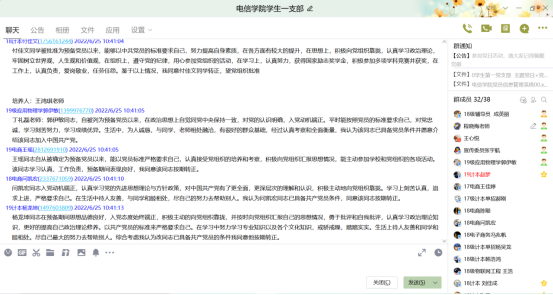 最后程晓梅对转正材料质量、态度等问题进行了说明,着重强调,成为一名共产党员不是要富有优越感,而是要增强自身服务他人、懂得奉献的意识。在就业、志愿服务等方面都应该具有先锋带头作用,时刻对自己高标准严要求,展现出当代大学生党员的良好精神风貌。希望每一位党员在今后的工作和学习中,都能做到严以律己、精益求精、不忘初心、砥砺前行,以优异成绩迎接党的二十大胜利召开。
