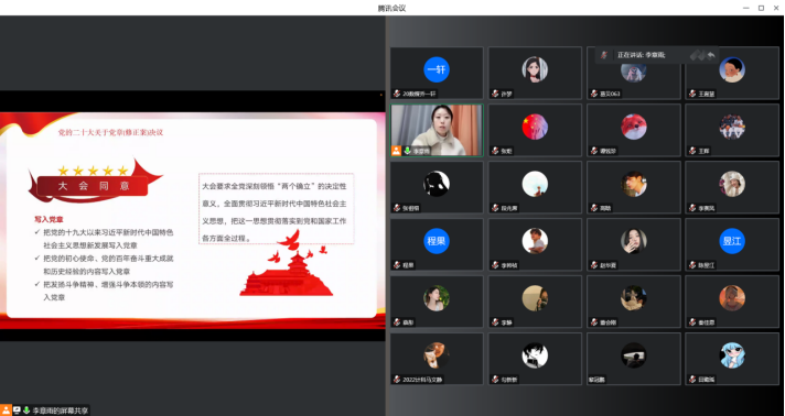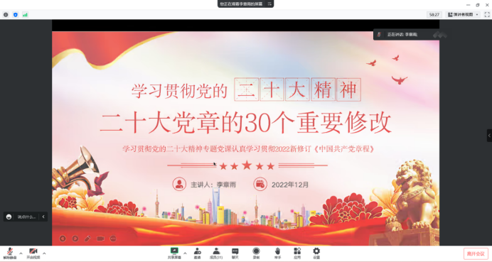 为深入学习贯彻党的二十大精神,深刻领会、准确把握党的二十大精神实质和丰富内涵,切实引导党员把思想、认识和行动统一到学习、宣传、贯彻党的二十大精神上来,2022年12月27日,PP电子游戏平台网站学生第二党支部书记李章雨以围绕学习宣传贯彻党的二十大精神,从二十大主题、社会变革、历史地位、时代要求等方面对党的二十大重要内容进行了详细解读,结合自身学习体会和工作实际,深入浅出地为全体党员上了一堂生动的专题党课,推动党的二十大精神学深悟透、落到实处。