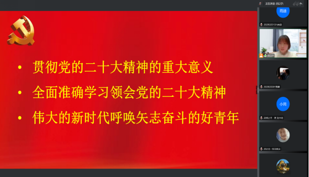2022年12月27日PP电子游戏平台网站学生第一党支部书记吕以宁通过线上腾讯会议平台,以学习党的二十大精神为主题,为学生第一党支部全体学生党员上了一堂生动的专题党课,推动党的二十大精神学深悟透、落到实处。