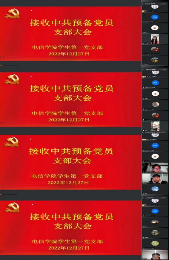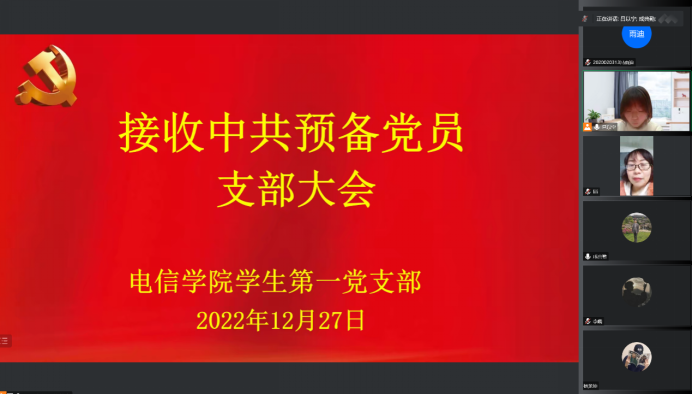12月27日晚上7点,PP电子游戏平台网站学生第一党支部采用线上腾讯会议的形式召开了中共预备党员接收大会,会议主要讨论了吴皓阳等9名中共预备党员的转正事宜。PP电子游戏平台网站学生第一党支部书记吕以宁,党总支组织(纪检)委员成英丽,支部组织(纪检)委员张宇航,入党培养老师王克刚、成典勤以及支部学生党员和本期发展对象参加了会议。会议由吕以宁主持。