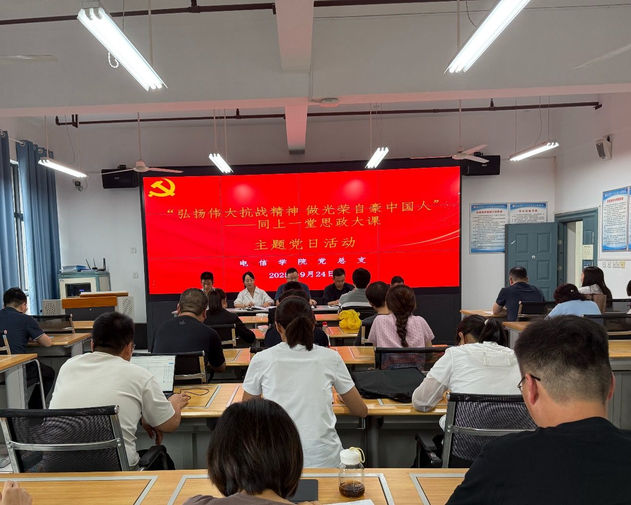 9月24日,学院党总支组织召开“弘扬伟大抗战精神,做光荣自豪中国人”主题党日活动,全体教工党员参加。活动集中学习了习近平总书记在纪念中国人民抗日战争暨世界反法西斯战争胜利80周年大会上的重要讲话,深入解读伟大抗战精神的深刻内涵与时代价值。教工党员结合教育教学与科研实际展开热烈讨论。党总支书记田静强调,全体教师要以抗战精神强化育人担当,将红色基因融入专业教育,培养不负时代使命的电信人才。