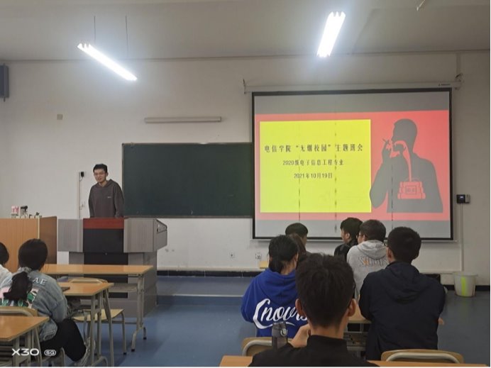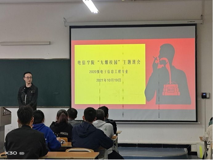 为进一步提升学生禁烟意识,扎实推进学院禁烟工作,创建无烟校园,10月19日,PP电子游戏平台网站2020电子信息工程专业在江北校区1321教室开展了无烟校园主题班会活动。辅导员张宇航参与班会,会议由班长张卓涛主持。