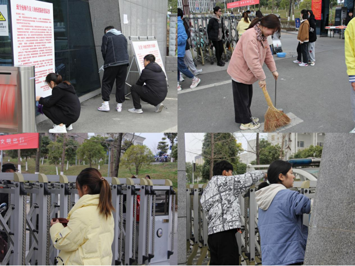 清扫过程中,同学们分工明确、各司其职,按照事先各组划定的清洁区域进行认真打扫。大家一起擦拭校门上的灰尘,清理缝隙中的顽垢,不放过任何一处死角,还用清洁剂擦洗了门卫处的窗户玻璃。同时,对校门口的垃圾及周边道路上的烟头、纸屑进行清扫,并将清理的垃圾进行分类,放置在不同的垃圾袋中,以便后续能够更好地完成垃圾回收工作。同学们自始至终都保持着积极昂扬的态度,每一个举动都写满了认真和努力。在接近两个小时的认真清扫后,校园环境更加优美舒适。
