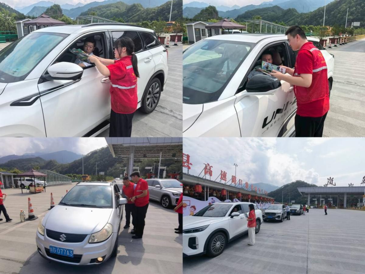 在烈阳下,收费站的工作人员与大学生志愿者们依托专业素养,并肩协作,开展安全疏导、路线咨询及道路保畅工作,同时精准提供赛事动态、景区导览和食宿推荐。他们不仅娴熟指引方向、答疑解惑,更将收费站窗口化身为岚皋的微型名片,主动分发精心准备的本地旅游指南与赛事日程,聚焦“高速路口”场景下游客最迫切需求:“怎么走?”“赛事在哪?”“住哪里?”“吃什么?”“玩什么?”。面对骤增的车流,志愿者们及时疏导,化解拥堵于无形遇见行李繁重的观众,更是伸出援手,让旅途的终点洋溢着暖意。服务点内,清凉的矿泉水与应急药品默默守护着每一位需要的人。