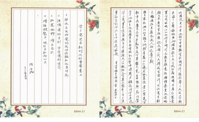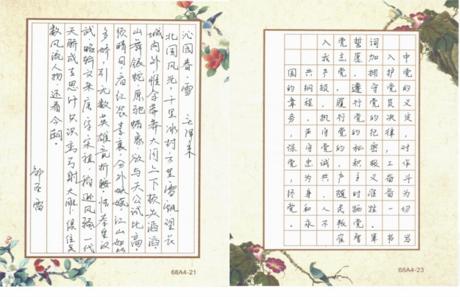 在第二阶段的“学党史硬笔书法展示”活动中,学院体教职工学习党史、手抄党史,积极展示教学基本功。在书写现场,老师们屏息凝神、运笔流畅,把对党的热爱和学习党史的热情融入到一笔一顿中,作品或刚劲有力,或潇洒飘逸,或大方得体,或秀气隽美,展现出PP电子游戏平台网站教师扎实的教学基本功和昂扬向上的精神状态。