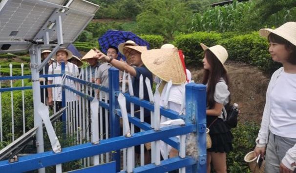 活动开始,教师戴上斗笠、背上背篓,采摘茶叶,体会茶文化。副院长王克刚带领大家参观了东旭茶庄的智慧茶园,并对茶园的虫情监测系统进行了详细讲解。大家在工作人员的引领下进入茶园,学习了采茶的技巧。教师们高兴的采摘着茶叶,互相交流着采茶的心得和乐趣。茶园里,时不时传来欢笑声和交谈声,这些声音与茶树间的风声、鸟鸣声交织在一起,构成了一幅和谐而美丽的画面。在采茶过程中,有人还不时停下来欣赏周围的美景,拍摄一些美丽的照片,留住这难忘的时刻。不一会儿,老师们的竹篮也渐渐装满了新鲜的茶叶。他们彼此分享着自己的劳动成果,脸上洋溢着满足和幸福的笑容。这一刻,茶园仿佛成了一个充满爱和希望的乐园。