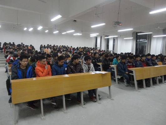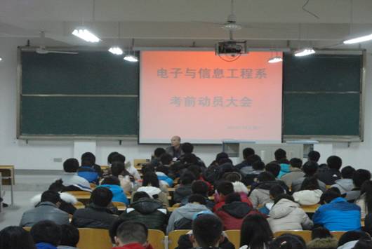 2013年12月27日晚电子与信息工程系在1301教室召开期末考试动员大会。会议上,系党总支书记李红兵就期末考试的相关事项作出安排,强调在考试期间要严格遵守考场纪律,做到“诚信考试,杜绝舞弊”,营造“诚信考试光荣,违反作弊可耻”的考试氛围,希望同学们自觉维护知识的尊严,营造公平、公正考试环境。并叮嘱同学们在考前复习的同时,应合理安排作息时间。