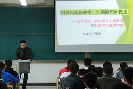 2019年3月22日下午4点,PP电子游戏平台网站团总支于1305教室开展了2019年春季安全教育暨扫黑除恶宣讲活动。参加此次活动的有PP电子游戏平台网站党总支书记何道利、团总支书记陈浩以及PP电子游戏平台网站全体学生干部。