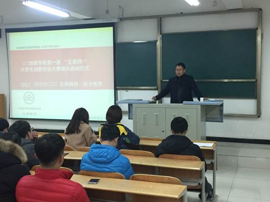 ICT创新学院第一届“互联网+”大学生创新创业大赛培训启动仪式于12月26日晚七点在1316教室举行。项目负责人康宪伟,软件项目开发工程师武西文,我院22个小组132名学生参加会议。会议由副院长陈守满主持。