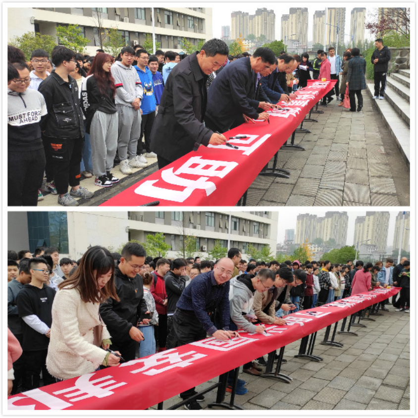 最后参加活动的老师和学生在横幅上签名,留下自己厉行节约反对浪费的承诺。