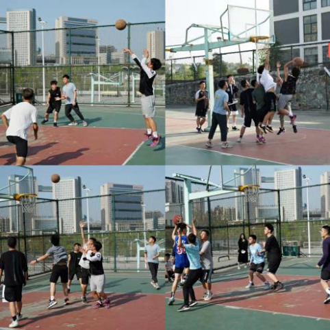 4月5日3V3篮球对抗赛如期举行。同学对前两天比赛的积极参与,在第三天达到热情空前。篮球赛由班内同学自行组队,每队3-4人,男生采取21分制,女生15制。裁判员鸣笛,战幕拉开,赛场上发球、运球、传球、断球、防守、进攻不断,选手们严守硬对、默契传球、完美配合。场边的同学自发组成拉拉队,为选手们进球呐喊,为突破助威。