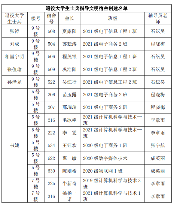 PP电子游戏平台网站退役大学生士兵指导文明宿舍创建名单