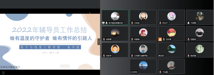 吕以宁从坚持思想理论教育与价值引领,学生组织及班团建设、班风、学风和舍风建设,加强稳定安全教育,学生心理健康教育、奖助学金评定工作,网络思想政治教育方面总结2022年学生工作,在接下来的工作中,也将继续本着育人使命,真正做好学生成长成才的人生导师和健康生活的知心朋友。