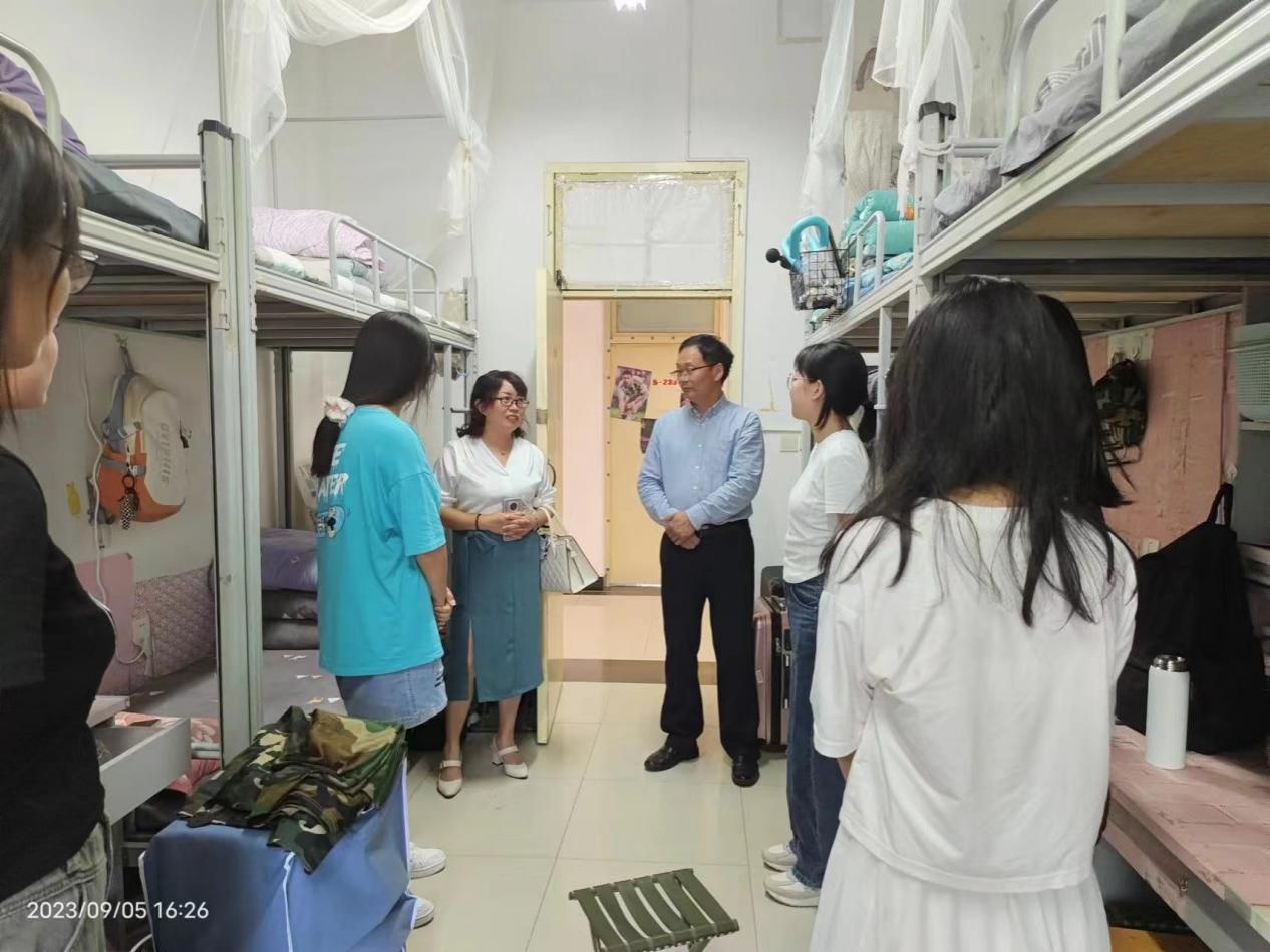 新学期、新征程、新起点、新希望。为推动新学期学生教育管理工作有序开展,进一步加强新生宿舍管理,帮助新生适应大学宿舍环境。9月5日,PP电子游戏平台网站院长陈守满,党总支书记于咏梅,副院长王克刚、宋权华,党总支副书记蔡正旺,辅导员成英丽分别走访4、5、6、7号学生公寓,看望PP电子游戏平台网站2023级全体新生。