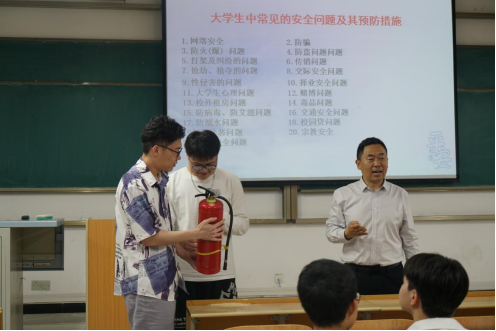 王开忠从“安全”二字出发,就国家安全、网络安全、电信诈骗、用火用电安全等对学生展开了多方面的教育。在国家安全部分,他讲到国家安全关系到国家的生死存亡,关系到国家的长治久安,当代大学生一定要有保护国家安全的意识,从现代化的角度出发防范科技犯罪;网络安全是学生人身安全和财产安全的重灾区,尤其是网贷方面,学生陷入网贷人数之多,金额之大令人咋舌,他提醒学生在诱惑面前要有防范意识,要有求助意识,要学会拒绝;在防电信诈骗讲解中,他分享了“十个凡事,十个绝不”反诈提醒,告诉同学们要牢记“要钱不给,给钱不要”,切勿贪小便宜吃大亏;在用火用电安全中,他提到火灾紧急疏散逃生自救十要素,现场提问学生遇到火灾的紧急处理办法,并现场展示灭火器的使用方法,告诉学生生命高于一切,务必学会必要的逃生措施。