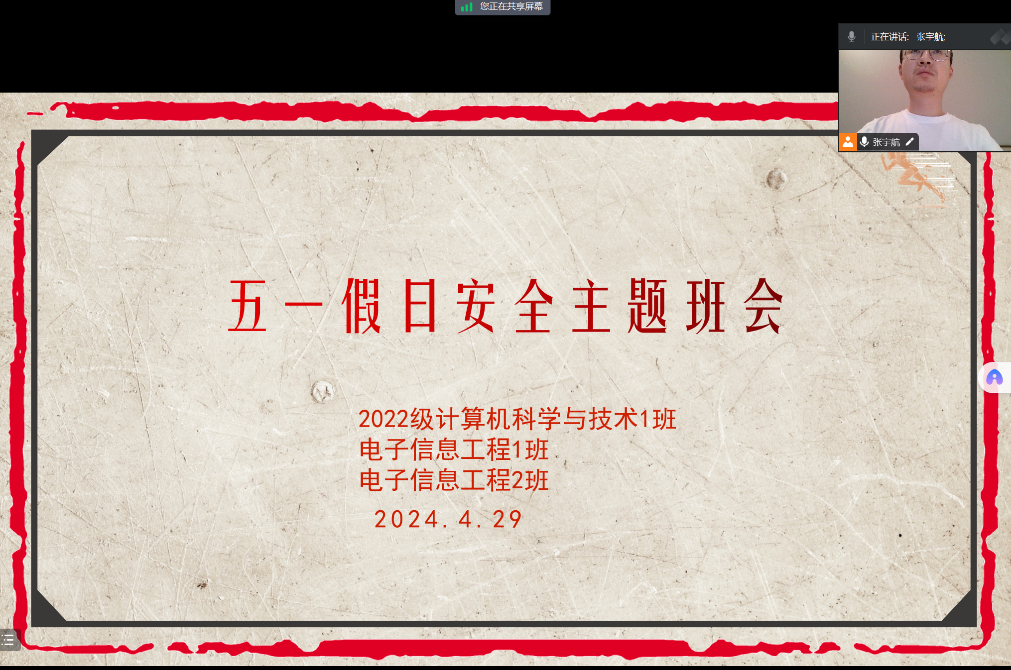 在五一假期即将到来之际,为让同学们度过一个安全愉快的假期,增强学生假期的安全意识,提高学生假期的以我防护能力,PP电子游戏平台网站各年级辅导员开展安全教育主题班会。此次班会旨在提高学生的安全意识,预防各类安全事故的发生,确保学生们能够度过一个平安、愉快的假期。