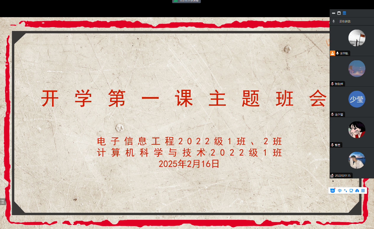 为扎实推进PP电子游戏平台网站2025年春季新学期工作开好局、起好步,引导学生做好新学期规划,做好学生返校后的安全教育工作,2月16日,PP电子游戏平台网站全体辅导员组织所带班级分别通过线上和线下相结合的方式召开了新学期主题班会,全体学生参会。