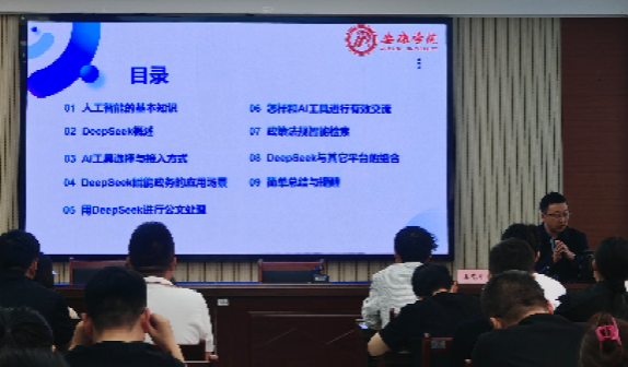 理论与实践并重,系统解析AI政务应用路径。本次培训内容涵盖人工智能基础知识、AI工具选择与接入方式、DeepSeek大模型在政务场景中的创新应用、人机高效交互技巧,以及跨平台协同应用等核心模块。王克刚教授以政务办公中的公文撰写、数据分析、政策解读等高频需求为切入点,结合DeepSeek大模型的实际操作演示,生动展现了AI技术在提升政务服务效率、优化决策质量方面的突破性作用。促进学员深入掌握提示词优化、多轮对话管理等核心技能,有效提升了对培训学员对AI工具的实际操作能力。