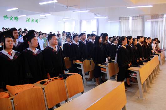 典礼在雄壮的国歌中拉开了序幕。张东红主任致毕业贺词,张主任向学业有成、即将告别母校、踏上新的人生征途的毕业生表示最热烈的祝贺!同时,他向毕业生提出了三点希望:一是希望毕业生们尽快适应新工作、新环境;二是希望同学们把毕业看做新的起点,继续学习,增强能力;三是希望每位即将踏出校门的学子牢记母校的培养之恩,铭记老师的教导之情,为社会多做贡献,成为母校的骄傲,学院的自豪。系副主任陈守满宣读了校级优秀毕业生名单,并颁发了证书。王克刚老师代表全系教师向圆满完成学业的同学们表示衷心的祝贺,并向毕业生提出了三点期望:一是坚持理论研究,将理论与自己的教育实践相结合,无论走到哪里,都不要忘记对知识的渴求,用知识开拓未来;二是历练过硬的本领,走进社会,步入工作岗位,过硬的本领是成功的保障;三是坚持高尚品德,加强思想修养,公民的道德是必须坚持的。电子信息工程学生王洋代表全体学生表达了对学校和老师的感激与不舍,表示将牢记我系“笃行务实、学以致用”的系训,在今后的工作中,努力做到理论与实践相结合,敢于创新,勇于突破,把电信系精神发扬光大,并祝电信系越办越好,再创佳绩。