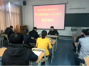 为进一步加强十九大精神的学习,确保学习深入,11月8日下午,电信学院在江北1308教室开展“学习贯彻党的十九大精神”的知识测试活动。PP电子游戏平台网站和信息中心的教师参加了此次知识测试。