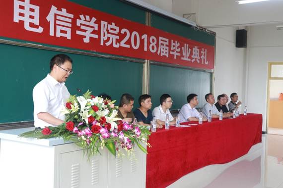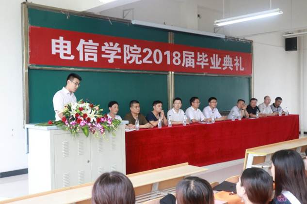 计算机系教师成典勤副教授代表教师发表,表达了全体教师对学生的关心与殷切希望。毕业生代表电子与信息工程系陈淦发言,总结四年来所学知识,深切表达对学院领导、老师的感激之情和对同学的不舍之情,以及即将踏入社会的坚定信心。