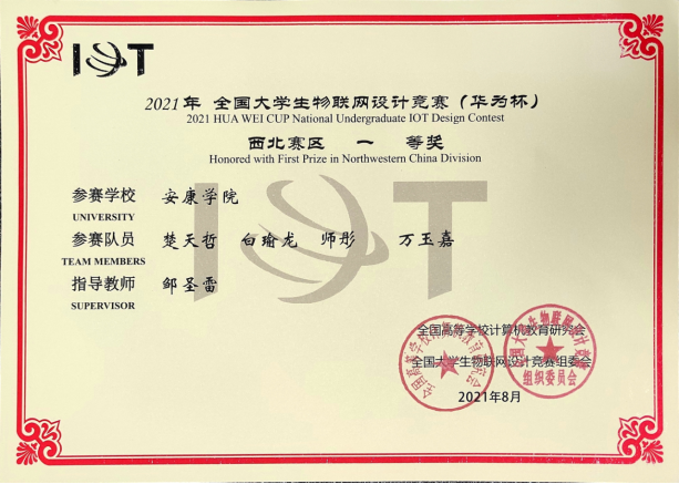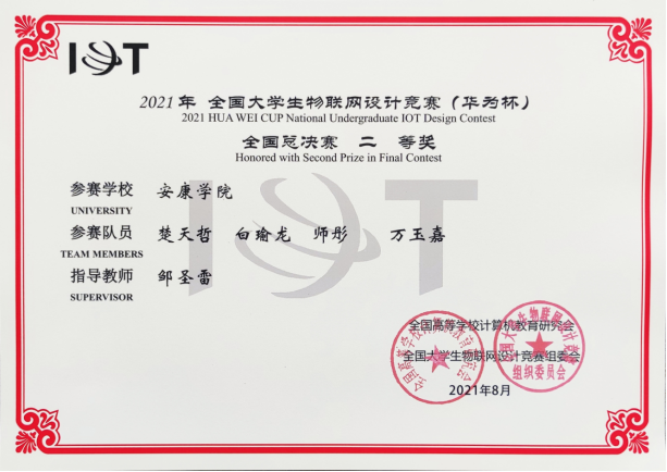 近日,2021年全国大学生物联网设计竞赛(华为杯)全国总决赛在上海紫竹科学园隆重举行。PP电子游戏平台网站邹圣雷老师指导的学生团队(楚天哲、白瑜龙、师彤、万玉嘉)表现出色,在西北赛区获一等奖入围全国总决赛,最终荣获全国二等奖。