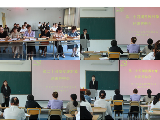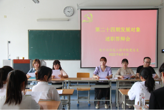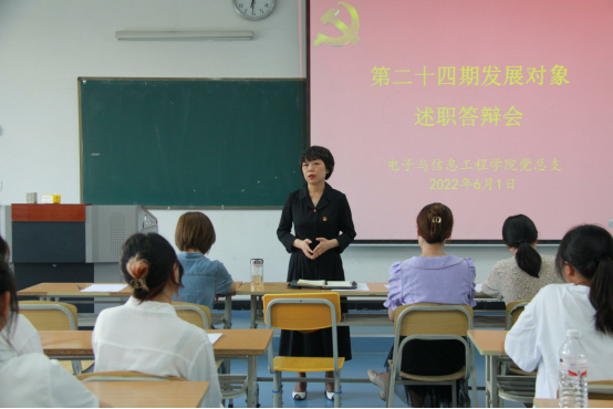 为深入贯彻落实党的十九大精神和习近平新时代中国特色社会主义思想,把好党员“发展关”,切实提升党员发展质量,结合支部党员发展工作需要,6月1日下午,PP电子游戏平台网站学生第一、第二党支部在江北校区1319教室开展了2022年上半年发展对象述职答辩会,PP电子游戏平台网站党总支书记于咏梅,党总支组织委员成英丽,学生第一党支部书记程晓梅、组织(纪检)委员张宇航,学生第二党支部书记李章雨、组织(纪检)委员石纭昊、辅导员吕以宁以及19名第24期发展对象参加答辩会。会议由学生第二党支部书记李章雨主持。