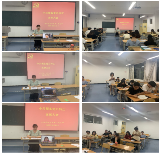2022年6月25日下午,PP电子游戏平台网站学生第二党支部在1319教室召开了中共预备党员转正党员大会,会议主要讨论关于2018级电子信息工程1班赵东勃、尚佩瑶,2018级数字媒体技术1班刘艳红、陈凡、黄娥,2019级电子信息工程1班李思雨,2019级数字媒体技术1班许梦,共7名中共预备党员的转正事宜。PP电子游戏平台网站学生第二党支部书记李章雨,入党培养老师王磊老师以及支部全体学生党员线上线下结合的方式参加了本次会议。会议由李章雨主持。