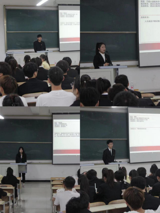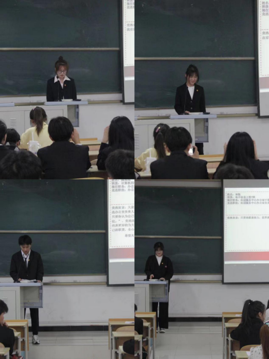 参与团总支、学生会、社团服务中心干部竞选的同学根据换届选举竞选要求,依次上台进行5分钟竞选演讲。竞选环节中,各位参选同学满怀信心和激情,以端庄大方的仪态和饱满的精神状态走上舞台,就自己的基本情况、对工作岗位的认知、竞选原因以及工作设想进行了演讲。激烈慷慨的演讲将此次竞选会议一次次推向高潮,赢得了大家热烈的掌声。