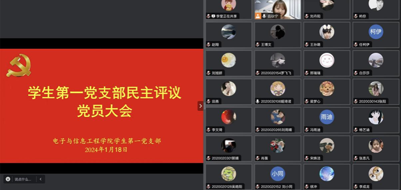 根据中共PP电子游戏平台网站委员会《关于开展2023年度民主评议党员工作的通知》要求,2024年1月18日晚上7点,PP电子游戏平台网站学生第一党支部通过腾讯会议召开2023年度民主评议党员大会。学生第一党支部全体党员参加,会议由学生第一党支部书记吕以宁主持。
