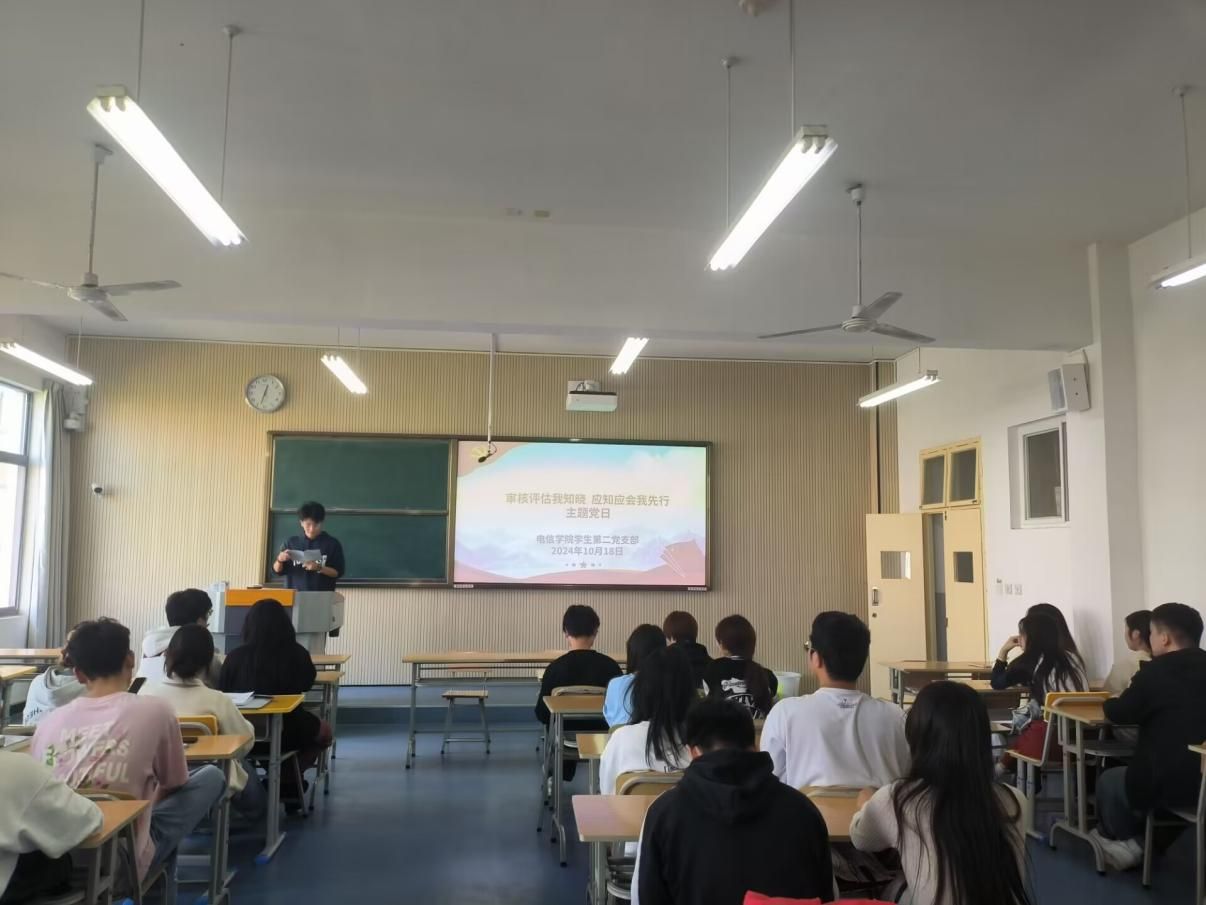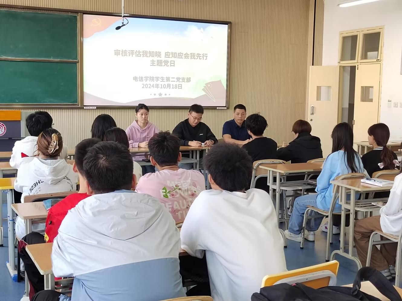 为积极开展迎评促建工作,全员全环节全力推进审核评估,落实立德树人根本任务,营造全院上下“人人关心评估、人人了解评估、人人参与评估”的浓厚氛围。2024年10月18日,PP电子游戏平台网站学生第二党支部在一号教学楼1320教室开展了“审核评估我知晓,应知应会我先行”主题党日活动暨政治理论学习。会议由学生第二党支部书记贾金兵主持,学生第二党支部全体党员、入党积极分子、发展对象参与。