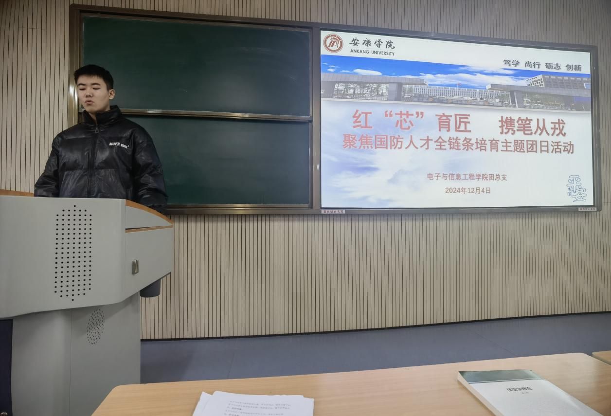 为聚焦退役大学生士兵回校后继续发扬部队‘特别能吃苦、特别能战斗、特别能奉献’的光荣传统和优良作风,引导“芯”青年牢固树立纪律规矩意识,自觉培养高尚道德情操,涵养清正廉洁的作风品行,动员更多符合强军需求的大学生青年投身国防事业,为部队输送更多有志青年。12月4日,PP电子游戏平台网站以“红‘芯’育匠 携笔从戎”为主题开展聚焦国防人才全链条培育主题团日活动。学院党总支书记于咏梅、学生工作办公室主任石纭昊、团总支书记张宇航、党总支组织委员成英丽、学生第一党支部书记翟子轩、学生第二党支部书记贾金兵、全院退役大学生士兵及各班级主要干部参加活动。