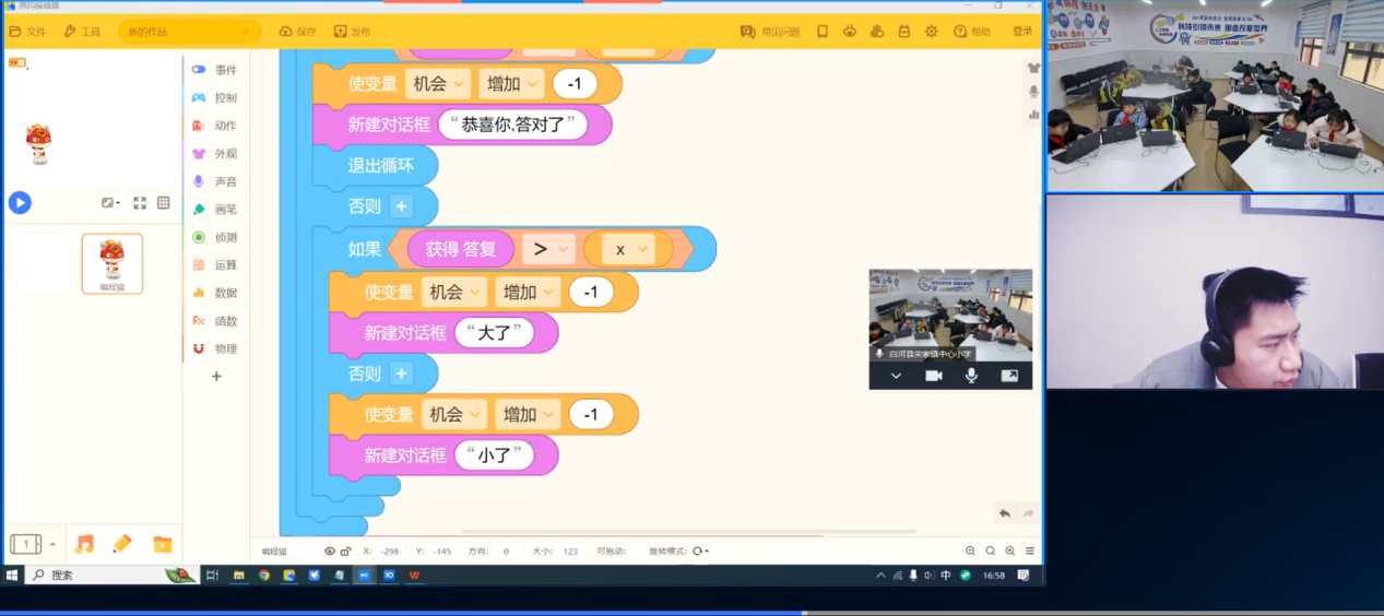 课堂之上,支教队员摇身一变,成了活力满满的 “云端讲师”。,他们借助精心制作、生动有趣的动画演示,搭配妙趣横生的互动游戏,巧妙的将原本晦涩复杂的编程概念转化为孩子们一听就懂、一学就会的通俗语言。在别出心裁的“雷锋助人小游戏”项目里,孩子们全身投入,不仅学会了基本的编程逻辑,还在代码中融入了雷锋精神。当游戏角色伸出援手帮助他人时,将会获得“爱心值”。这种寓教于乐的方式,瞬间激发了孩子们的学习兴趣,将助人为乐的价值观念潜移默化地传递到每一个孩子的心田。