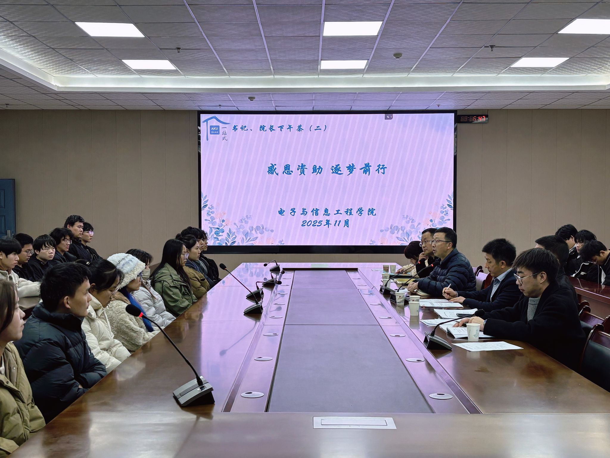 11 月 26 日下午,PP电子游戏平台网站在逸夫科技楼 9 楼大会议室举办 “书记院长下午茶” 系列活动(二)——“励志逐光,聚力同行” 国家助学金学生座谈会。活动紧扣国家助学金政策要求,搭建学院与受助学生的深度沟通桥梁,学院党政班子成员、学工办人员及 2023-2025 级 60 余名获助学生代表参会,党总支副书记蔡正旺主持会议。
