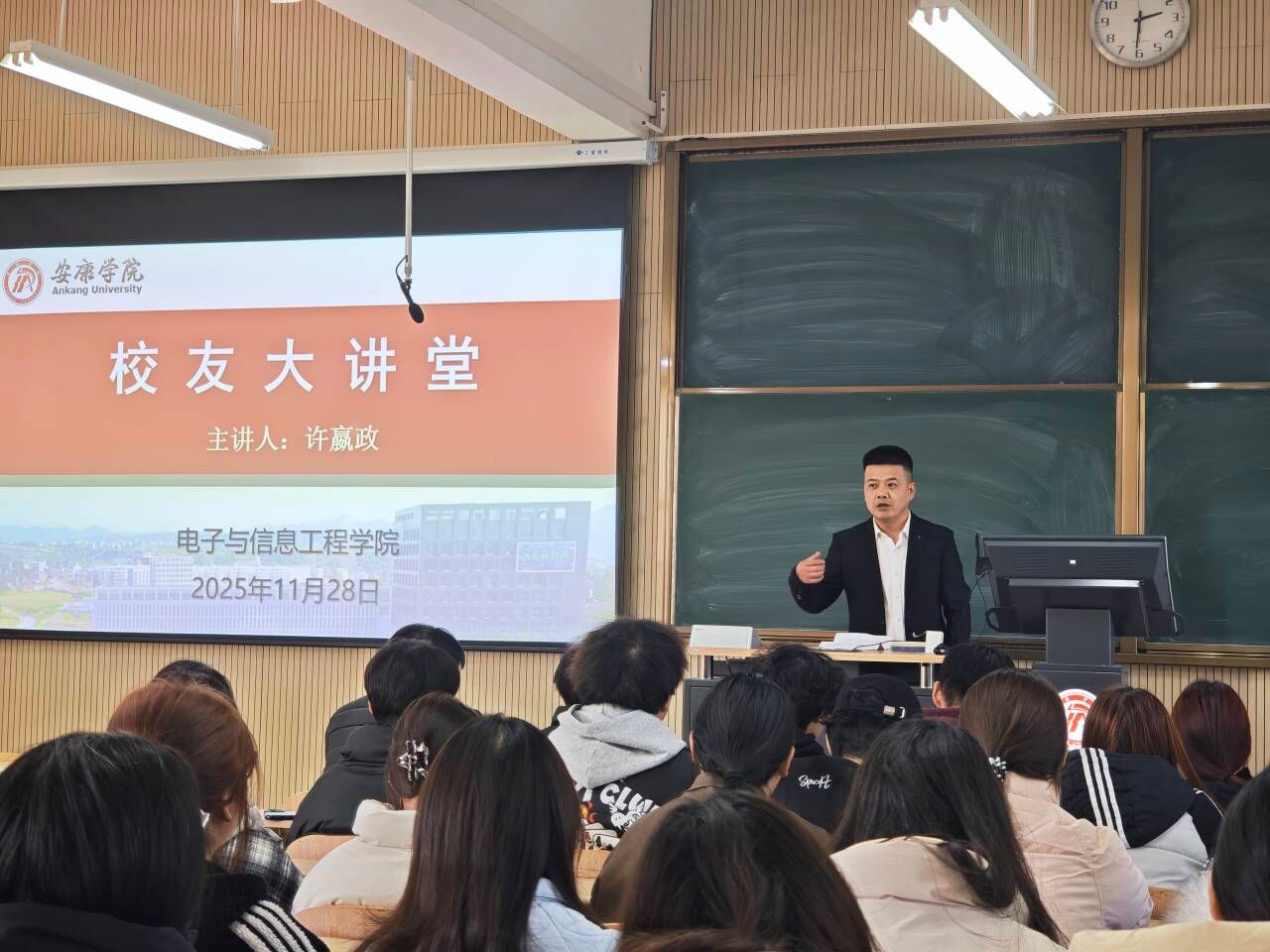 2025年11月28日下午,PP电子游戏平台网站在1304教室成功举办了“校友大讲堂”活动。本次活动特别邀请了学院优秀校友、2013届电子信息技术毕业生许嬴政担任主讲嘉宾,他以自身成长与创业经历为蓝本,为在校学子带来了一场兼具深度与温度的精彩分享,为母校人才培养与家乡高质量发展注入新动能。