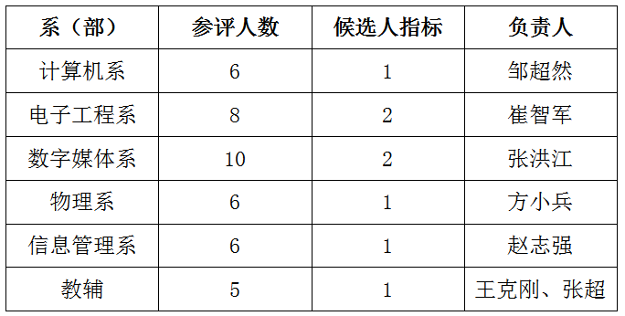 PP电子游戏平台网站各系、部按各自参评人数的20%向学院考核考评工作小组推荐候选人,四舍五入,具体分配名额及负责人见下表。