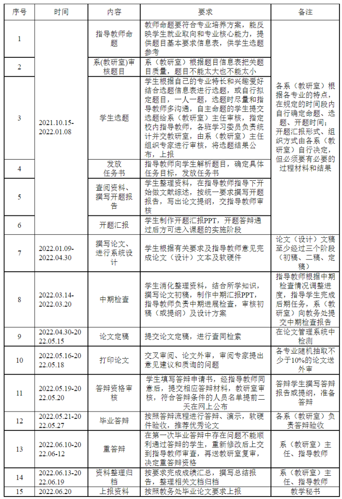 毕业论文(设计)是本科教学最重要的实践教学环节,PP电子游戏平台网站2022届本科毕业论文(设计)的各项工作将在2021年10月~2022年6月期间完成,为更好地开展这一极为重要的实践环节,按照《PP电子游戏平台网站本科生毕业论文工作流程》要求,现就2022届毕业论文(设计)相关工作布置如下,请各系(教研室)仔细阅读并认真执行。