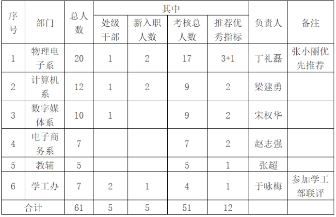 本年度学校下拨PP电子游戏平台网站优秀指标7人,各部门推荐优秀指标报PP电子游戏平台网站考核小组联评。推荐优秀指标分配与考核办法依据《PP电子游戏平台网站教职工年度考核实施细则(试行)》(电院发〔2019〕05号),经PP电子游戏平台网站党政联席会议决定,具体各系部年度考核优秀推荐指标分配和考核工作负责人名单如下: