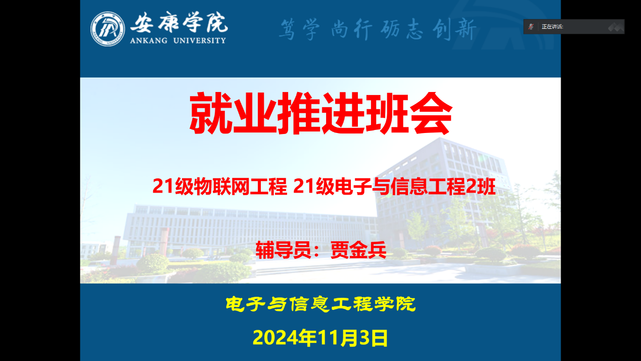 为帮助毕业生了解当前就业形势,明确就业方向,提升就业竞争力,近日,电子与信息工程学院通过线上线下相结合的方式召开了毕业生就业工作宣讲,此次会议由毕业班辅导员老师主持召开,全体毕业生参加。